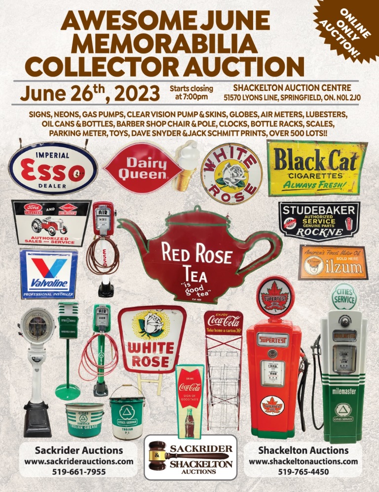Signs, Neons, Gas Pumps, Clear Vision Pump & Skins, Globes, Air Meters, Lubesters, Oil Cans & Bottles, Barber Shop Chair & Pole, Clocks, Bottle Racks, Scales, Parking Meter, Toys, Dave Snyder & Jack Schmitt Prints, Plus Lots More!!