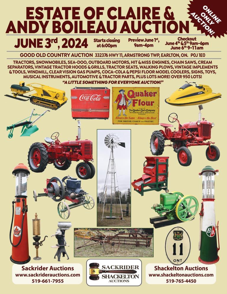 Tractors, Snowmobiles, Sea-Doo, Outboard Motors, Hit & Miss Engines, Chain Saws, Cream Separators, Vintage Tractor Hoods & Grills, Tractor Seats, Walking Plows, Vintage Implements & Tools, Windmill, Clear Vision Gas Pumps, Coca-Cola & Pepsi Floor Model Coolers, Signs, Toys, Musical Instruments, Automotive & Tractor Parts, Plus Lots More! Over 950 Lots!