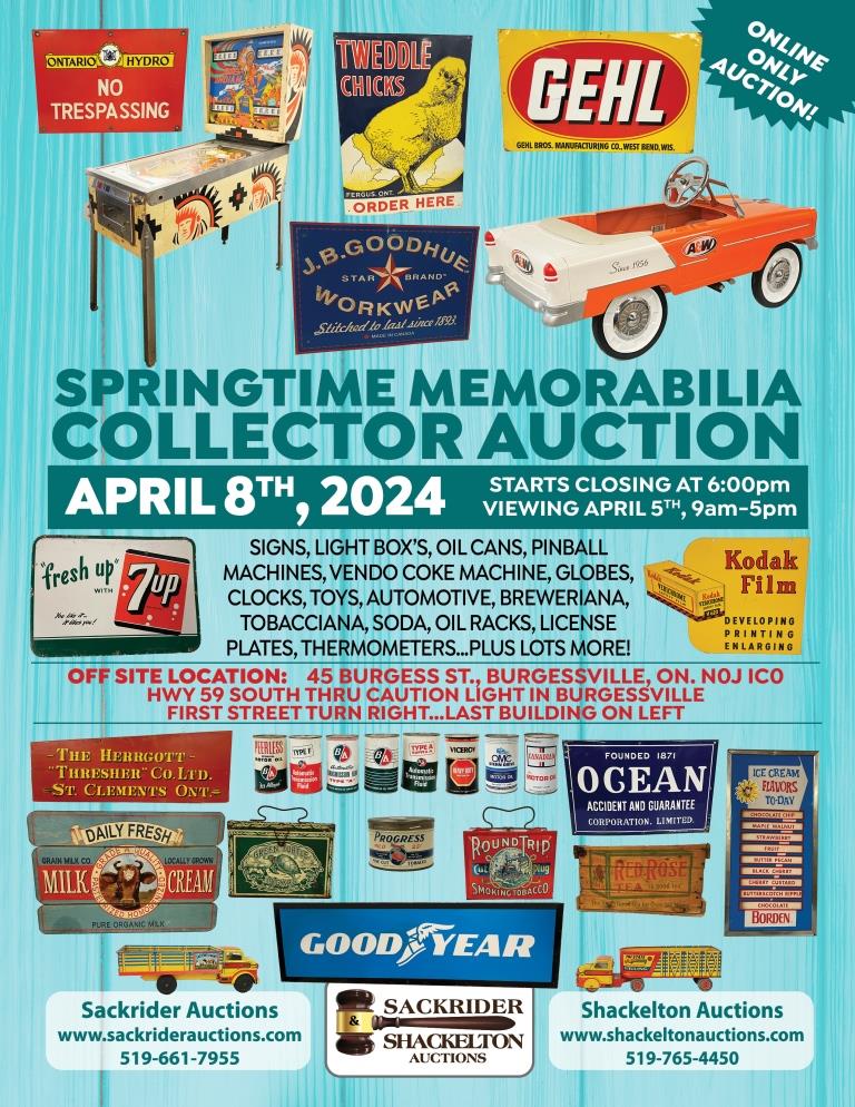 Signs, Light Box’s, Oil Cans, Pinball Machines, Vendo Coke Machine, Globes, Clocks, Toys, Automotive, Breweriana, Tobacciana, Soda, Oil Racks, License Plates, Thermometers+