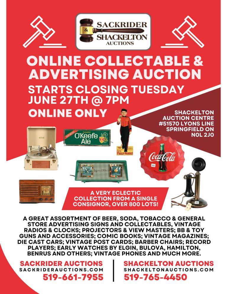 A very eclectic collection from a single consignor, over 800 lots including – a great assortment of beer, soda, tobacco & general store advertising signs and collectables, vintage radios & clocks; projectors & view masters; BB & toy guns and accessories; comic books; vintage magazines; die cast cars; vintage post cards; barber chairs; record players; early watches by Elgin, Bulova, Hamilton, Benrus and others; vintage phones and much more.