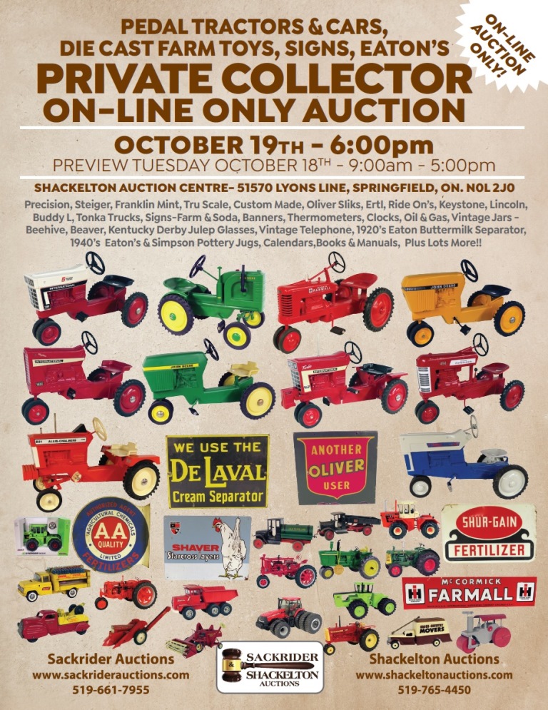 Precision, Steiger, Franklin Mint, Tru Scale, Custom Made, Oliver Sliks, Ertl, Ride On’s, Keystone, Lincoln, Buddy L, Tonka Trucks, Signs-Farm & Soda, Banners, Thermometers, Clocks, Oil & Gas, Vintage Jars - Beehive, Beaver, Kentucky Derby Julep Glasses, Vintage Telephone, 1920’s Eaton Buttermilk Separator, 1940’s Eaton’s & Simpson Pottery Jugs, Calendars, Books & Manuals, Plus Lots More!!